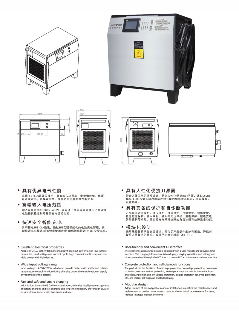 觸摸屏智能操作設(shè)計:告別傳統(tǒng)按鍵方式,給您帶來更現(xiàn)代更具科技智能的操作體驗 自動充電:插槍自動充電,簡化充電流程,便于操作 兼容性高:80V200A兼容48V200A充電 多重保護(hù): 輸出短路,過流過壓保護(hù),反接保護(hù),電流導(dǎo)管保護(hù)等多重保護(hù) 預(yù)約充電功能:避開高峰用電時段,有效節(jié)省成本 雙語切換:中英文雙語隨需切換,跨越語言障礙,與世界接軌 人性化設(shè)計:充電機(jī)背板內(nèi)部附部件明細(xì)及產(chǎn)品接線圖,方便客戶可更清楚的了解產(chǎn)品,便于維修,提高售后時效 獨(dú)特設(shè)計: 內(nèi)置電磁鎖驅(qū)動模塊,防止臨時斷電鎖槍 使用壽命更長:功率模塊預(yù)留20%空間,提高模塊的使用壽命 出色內(nèi)部結(jié)構(gòu): 內(nèi)部結(jié)構(gòu)左右出風(fēng),內(nèi)部電路不容易積粉塵,提高充電機(jī)壽命