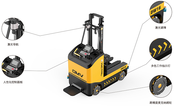 顛覆傳統(tǒng)叉車概念,零回轉(zhuǎn)半徑,側(cè)移,全方位無死角,任意漂移,告別傳統(tǒng)駕駛模式,可選配遙控器輕松操作,人身安全更有保障。新一代全向背負式堆垛車;麥克納姆輪全方位任意全向移動; 搭載激光自動導航系統(tǒng);設(shè)備運行時有聲光警示;并設(shè)有系統(tǒng)故障診斷及電量顯示功能;具備無人化、無線遙控功能;手動遙控定位精度達到±0.5mm; 窄巷道運行提升倉儲空間;控制面板顯示屏實時狀態(tài)顯示,并顯示故障信息。