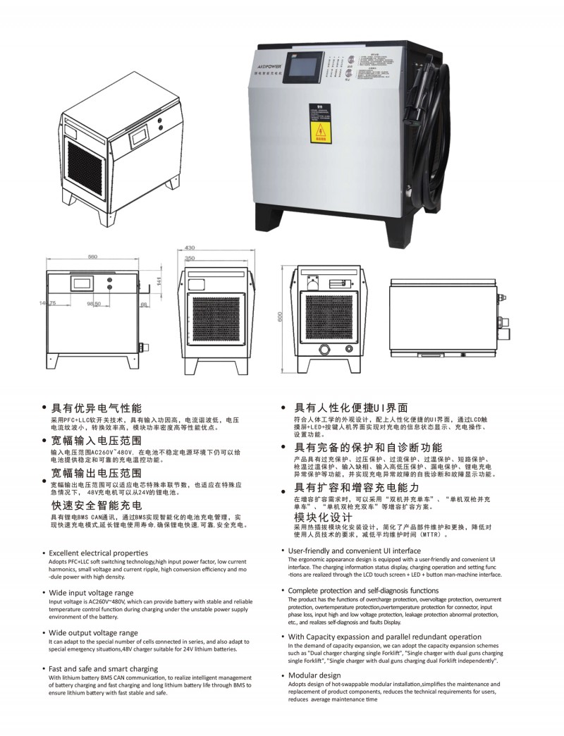 觸摸屏智能操作設(shè)計(jì):告別傳統(tǒng)按鍵方式,給您帶來更現(xiàn)代更具科技智能的操作體驗(yàn) 自動充電:插槍自動充電,簡化充電流程,便于操作 兼容性高:80V200A兼容48V200A充電 多重保護(hù): 輸出短路,過流過壓保護(hù),反接保護(hù),電流導(dǎo)管保護(hù)等多重保護(hù) 預(yù)約充電功能:避開高峰用電時(shí)段,有效節(jié)省成本 雙語切換:中英文雙語隨需切換,跨越語言障礙,與世界接軌 人性化設(shè)計(jì):充電機(jī)背板內(nèi)部附部件明細(xì)及產(chǎn)品接線圖,方便客戶可更清楚的了解產(chǎn)品,便于維修,提高售后時(shí)效 獨(dú)特設(shè)計(jì): 內(nèi)置電磁鎖驅(qū)動模塊,防止臨時(shí)斷電鎖槍 使用壽命更長:功率模塊預(yù)留20%空間,提高模塊的使用壽命 出色內(nèi)部結(jié)構(gòu): 內(nèi)部結(jié)構(gòu)左右出風(fēng),內(nèi)部電路不容易積粉塵,提高充電機(jī)壽命
