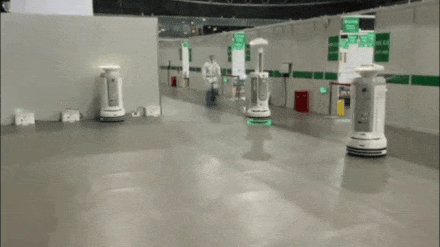 一名疫情防控工作人員路過正在工作的消毒機器人時,靠近機器伸出雙手,很快就完成了一次消毒。搭載紫外線燈、超干霧發生器和等離子空氣凈化等消毒模塊的消毒機器人,能在場館內自由穿梭,可以24小時“不眠不休”。