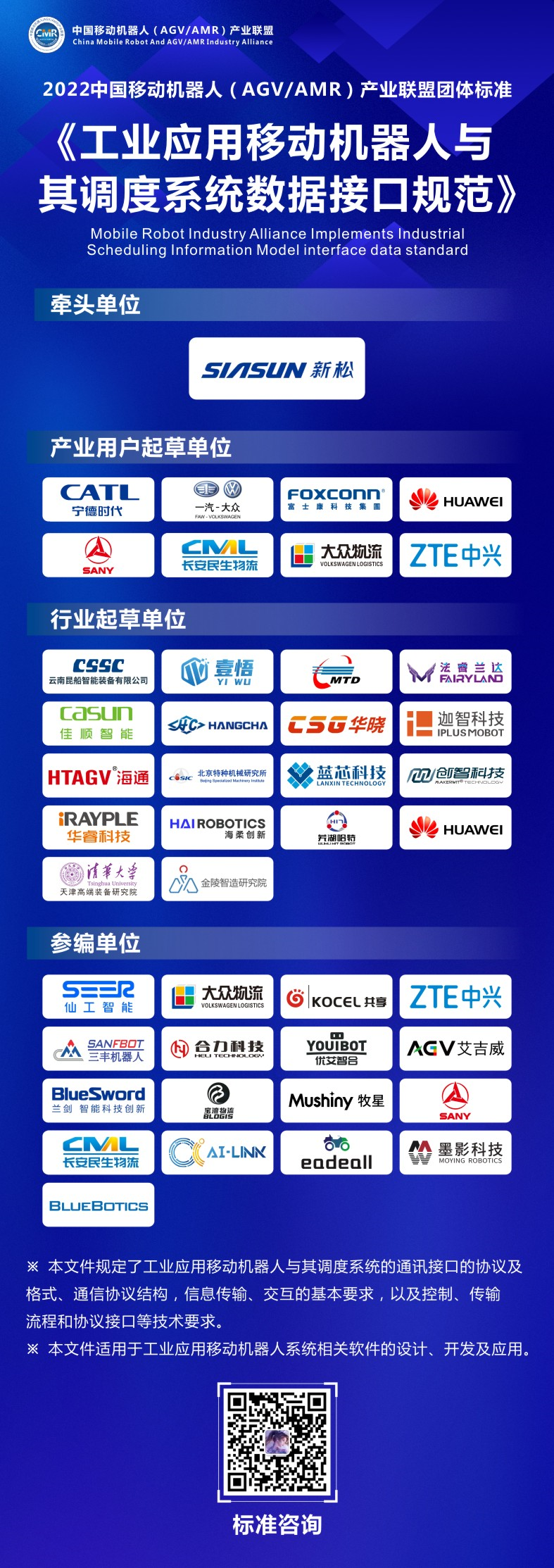 該標準邀請了包括寧德時代、一汽大眾、富士康、華為、三一、長安民生物流、大眾物流等多家終端應用客戶參與起草,將會對工業應用移動機器人與其調度系統的通訊接口協議產生重大影響,也是行業發展的必然趨勢。