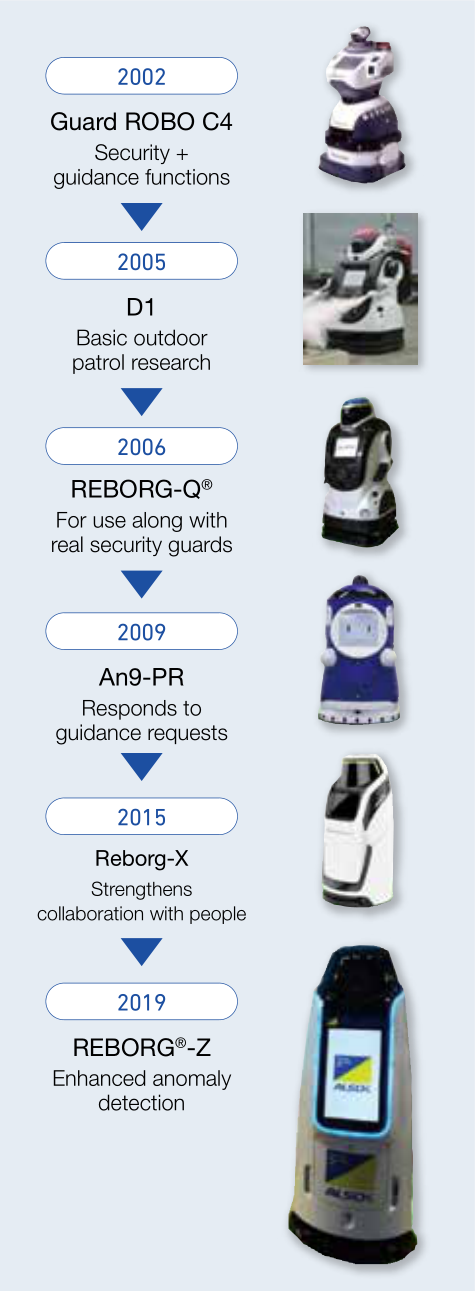 ALSOK 成立于1965年7月,是日本的一家大型安保公司。該公司早在1982年就預(yù)見到,未來將會面臨老齡化社會引起的勞動力不足問題,開始著手研發(fā)自主安保機器人,以提高勞動密集型的駐扎保安服務(wù)效率。