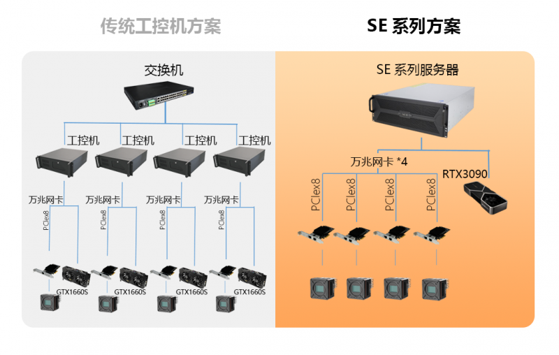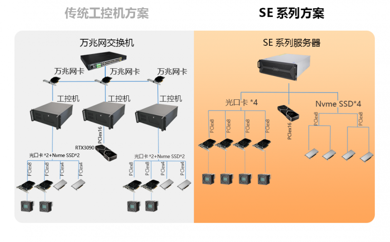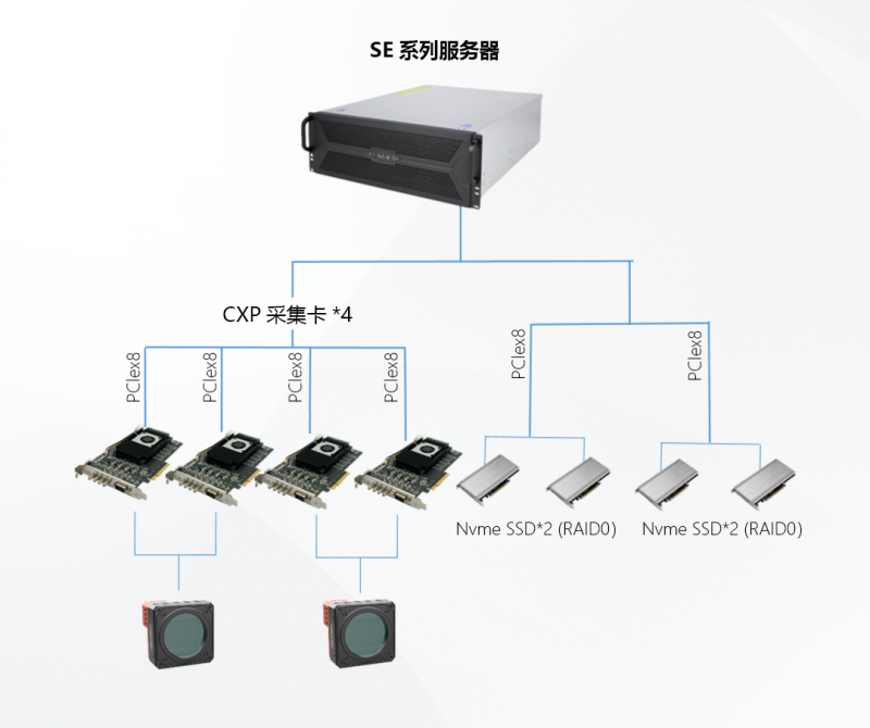 SE系列布置簡單、靈活,調試更便捷;一臺設備集多卡擴展、高速處理、高速存儲3合1,更省空間;搭配專業PCIe接口存儲設備,輕松實現高速存圖需求。