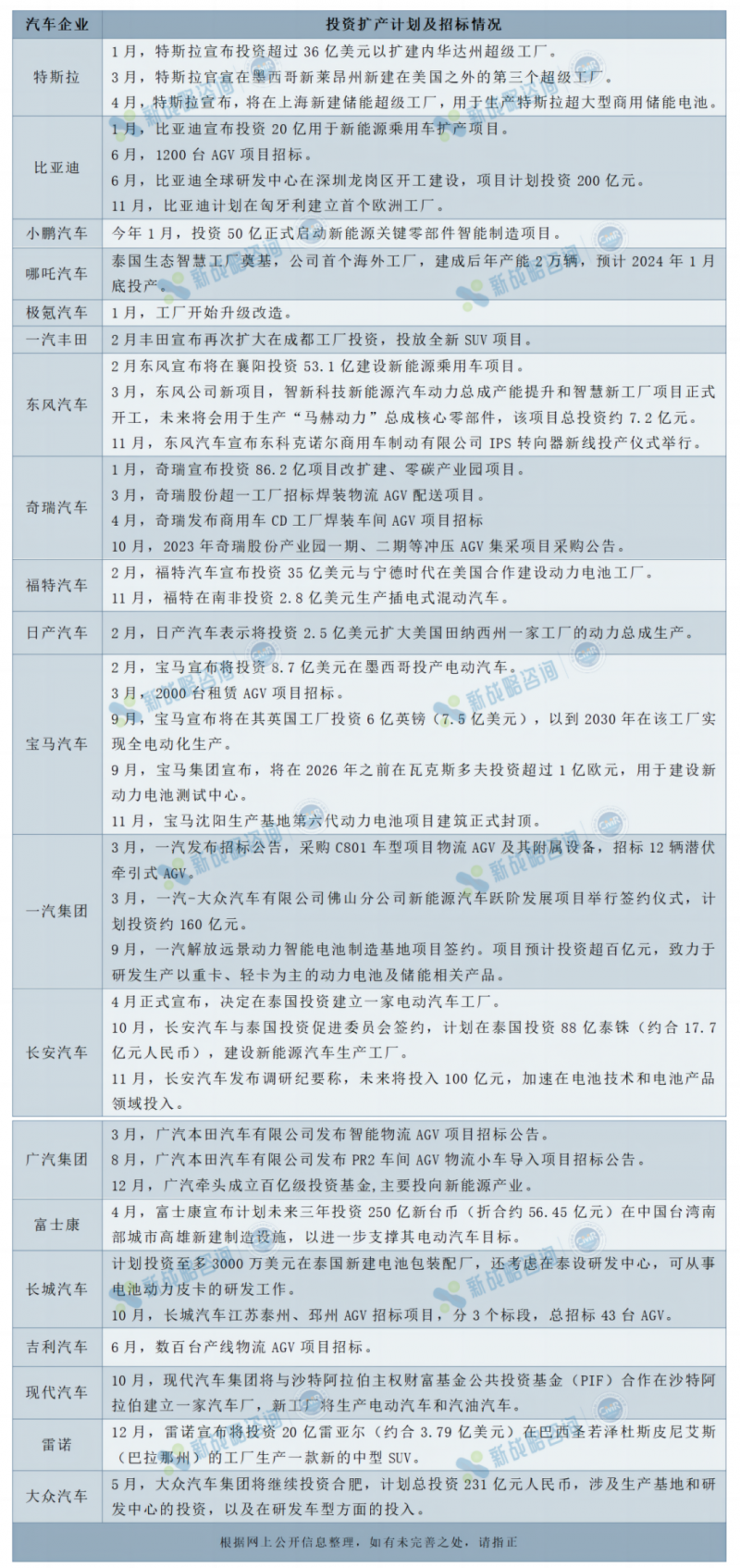 2023年1-12月主要車企投資擴產相關情況