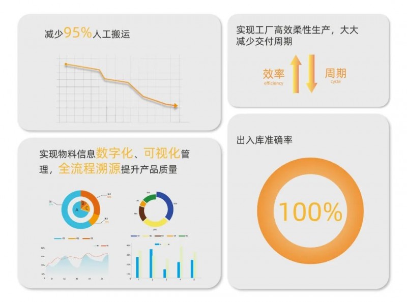 方案實現了對倉儲信息和產線訂單的全流程數字化管理,提高了信息的準確性和配送的及時性;物料信息全流程可追溯,大大提高了產品質量管理效率。