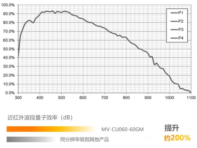 該相機(jī)近紅外波段的響應(yīng)效率顯著提升,能夠在近紅外光環(huán)境下保證成像效果,在常見(jiàn)的近紅外應(yīng)用中,如光伏、激光檢測(cè)、眼科醫(yī)療等應(yīng)用中,能夠確保細(xì)節(jié)的獲取與圖像亮度效果的呈現(xiàn)。
