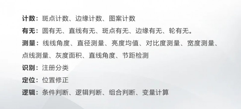 SC1000系列視覺傳感器集成計數、有無、正反、尺寸測量、AI注冊分類等20余種檢測算法,覆蓋各類常見傳感應用場景,同時可對激光、光電、位置等傳感器的一些應用的局限性進行有效的補充。