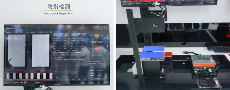 其中,隱裂檢測方案使用“4k黑白線陣相機+大靶面短波紅外鏡頭+穿透式近紅外線激光光源”,可對0.5mm以上尺寸的脫晶、崩邊、破片、隱裂以及疊片、臟污進行檢出與分類;在數(shù)據(jù)處理上,采用了新發(fā)布的SVA智能視覺處理卡方案,將軟件的大部分傳統(tǒng)算法與深度學(xué)習(xí)檢測模塊轉(zhuǎn)入這張采集卡內(nèi)工作,極大降低了工控機的硬件資源占用。