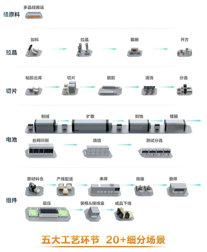 上述方案只是海康機器人眾多全場景解決方案中的一部分,憑借強大的移動機器人與機器視覺軟硬件技術(shù)實力,海康機器人打造的五大工藝環(huán)節(jié)20+細分場景的方案,已在眾多光伏項目中落地應(yīng)用,提高光伏生產(chǎn)效率,為光伏產(chǎn)品的高質(zhì)量保駕護航。