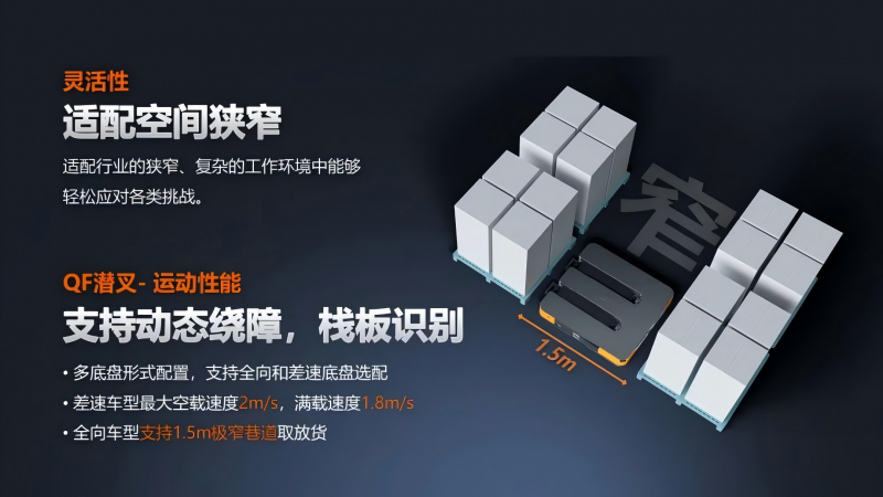 新一代Q1P的空載最高速度達4m/s,加減速性能大幅提升,兩車緊跟隨切換只需2s,揀選時切車換箱基本無感,減少任務(wù)切換的耗時浪費。同時無需輸送線,場地適應(yīng)性和業(yè)務(wù)擴展柔性更強 。