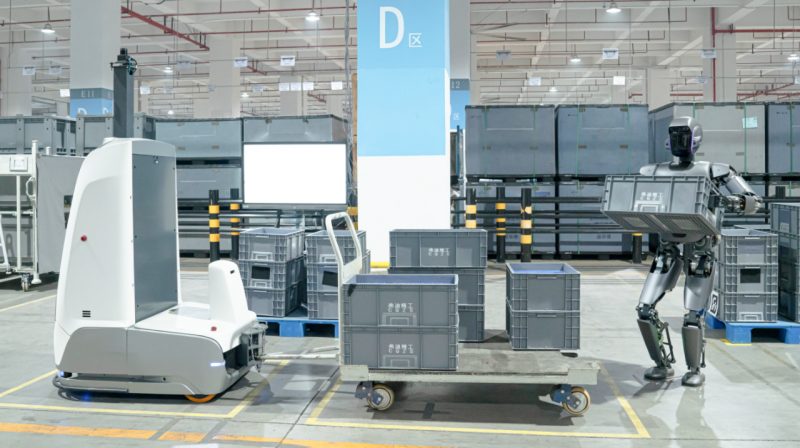 UQI優(yōu)奇的全棧式無人物流解決方案中,人形機(jī)器人可以與無人物流車、無人叉車等工業(yè)移動(dòng)機(jī)器人和智能制造管理系統(tǒng)協(xié)同完成分揀、搬運(yùn)和配送任務(wù)。人形機(jī)器人Walker S1接收UPilot移動(dòng)機(jī)器人操作系統(tǒng)的物料轉(zhuǎn)運(yùn)任務(wù),依托多模態(tài)大模型獲得定位和語義信息,從貨架上分揀物料至周轉(zhuǎn)箱中。Wali瓦力頂升移動(dòng)機(jī)器人U600將分揀好的周轉(zhuǎn)箱運(yùn)送到指定中轉(zhuǎn)位置,由另一臺(tái)人形機(jī)器人Walker S1將周轉(zhuǎn)箱搬運(yùn)到托盤上。接著,Wali瓦力重載無人叉車F3000自主導(dǎo)航到轉(zhuǎn)運(yùn)點(diǎn),將托盤從地面叉取并裝載到L4級(jí)無人物流車Chitu赤兔的車廂內(nèi),實(shí)現(xiàn)室內(nèi)外場景物流無人化的無縫銜接。