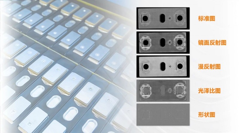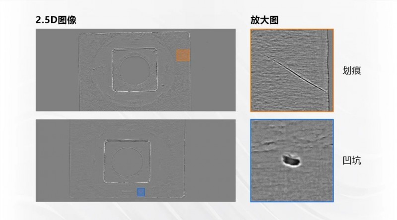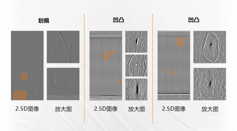 檢測效果:去除表面反光和臟污影響,將有深度變化的缺陷突出;根據(jù)臟污與樣品表面的反射特性不同突出臟污缺陷,同時與凹凸等缺陷進行區(qū)分