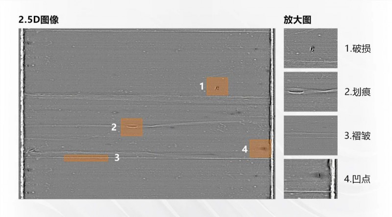 檢測效果:去除覆膜表面顏色和反光影響,有效檢出微小缺陷,對有無高度變化的缺陷進行區(qū)分