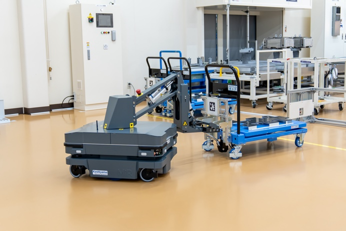 在日本樫山工業(yè)株式會社,工廠擴建后運輸距離大幅增加,傳統(tǒng)的自動導(dǎo)向車 (AGV) 難以滿足高效的內(nèi)部物流需求。MiR250 Hook 憑借模塊化設(shè)計與智能調(diào)度系統(tǒng),成為破解物流難題的關(guān)鍵。其搭載的激光 SLAM 導(dǎo)航技術(shù),能實時構(gòu)建工廠地圖并動態(tài)規(guī)劃最優(yōu)路徑,即使在狹窄通道與交叉路口也能實現(xiàn)毫米級精準避障。通過與工廠 MES 系統(tǒng)深度集成,MiR250 Hook 根據(jù)生產(chǎn)節(jié)拍自動響應(yīng)物料需求,減少傳統(tǒng)人工搬運中因視線盲區(qū)、操作失誤導(dǎo)致的工傷隱患,成為柔性物流體系中兼具效率與安全的 “萬能適配器”。?
