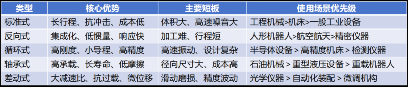 經(jīng)過長期發(fā)展,行星滾柱絲杠已演化出多個結(jié)構(gòu)變體,在傳動效率、承載能力、尺寸適配等方面形成各具優(yōu)勢的類型。其中,通過對不同結(jié)構(gòu)形式的性能對比與工程適配性分析,目前在人形機(jī)器人領(lǐng)域得到廣泛采用的是“反向式”行星滾柱絲杠結(jié)構(gòu)。