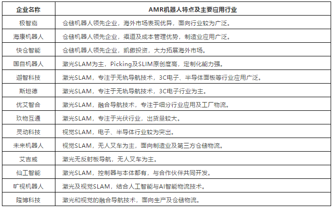 中國(guó)市場(chǎng),目前超過(guò)60%的工業(yè)應(yīng)用移動(dòng)機(jī)器人本體企業(yè)都擁有AMR產(chǎn)品,且企業(yè)數(shù)量還在不斷增多中,這其中有專注于自然導(dǎo)航產(chǎn)品的企業(yè),也有傳統(tǒng)的AGV、倉(cāng)儲(chǔ)機(jī)器人廠商及物流集成商等。