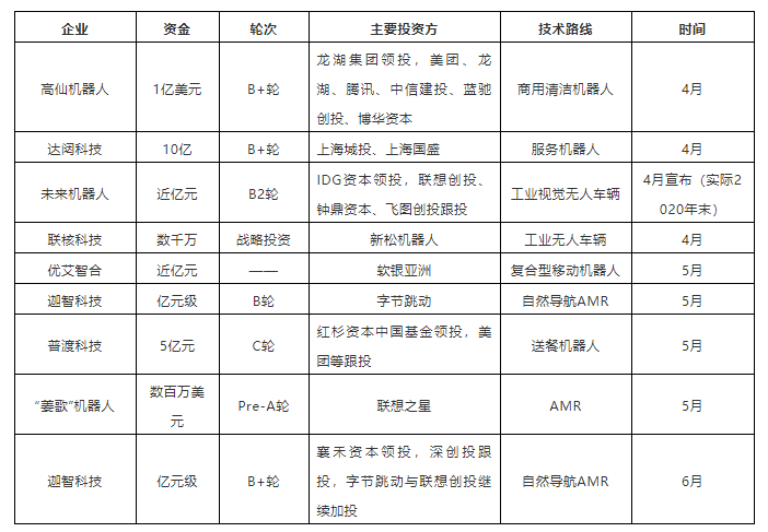 除工業(yè)應(yīng)用移動機(jī)器人外,二季度獲得融資的還有聚焦于清潔機(jī)器人應(yīng)用的高仙、云端服務(wù)機(jī)器人企業(yè)達(dá)闥科技以及送餐機(jī)器人企業(yè)普渡科技,疫情原因,商用移動機(jī)器人落地速度加快,經(jīng)過前期的落地應(yīng)用,部分技術(shù)成熟的企業(yè)脫穎而出,也得到了資本方的認(rèn)可。