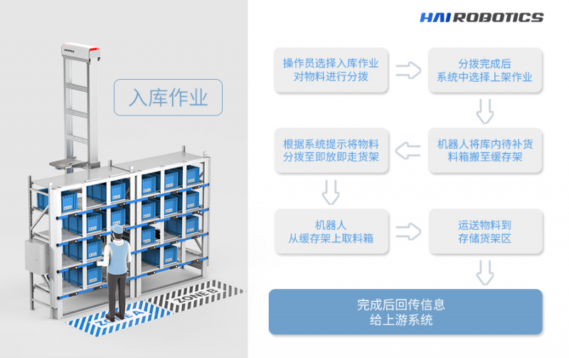 入庫(kù):通過(guò)緩存貨架的方式,減少人機(jī)等待時(shí)間,提升入庫(kù)的效率。