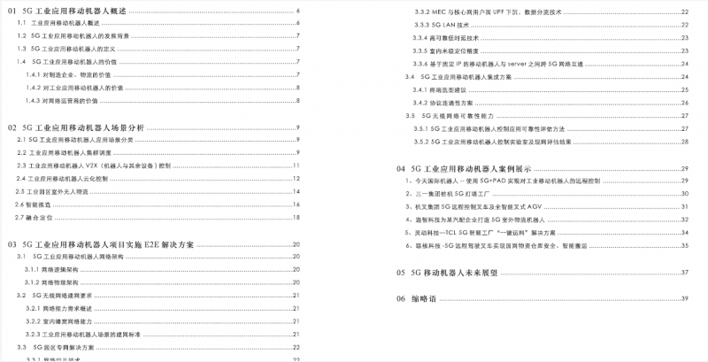 本藍皮書從5G工業應用移動機器人的發展背景出發,給出5G工業應用移動機器人的定義和價值,分析各種應用場景對網絡的需求,從架構、網絡、終端提出5G工業應用移動機器人可落地的解決方案,闡述可靠性能力,并給出各個應用場景落地實施的建議,幫助產業鏈各方共同推進 5G 智慧物流發展。