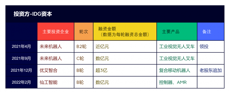 2021年4月至2022年2月期間,IDG資本在移動(dòng)機(jī)器人領(lǐng)域投資了未來機(jī)器人、優(yōu)艾智合和仙工智能三家移動(dòng)機(jī)器人企業(yè)。