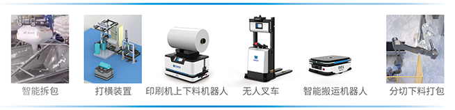 針對(duì)以上痛點(diǎn),藍(lán)芯科技以智能拆包裝置、打橫裝置、上下料機(jī)器人、無(wú)人叉車、搬運(yùn)機(jī)器人、分切下料打包自動(dòng)線為主體,結(jié)合智能倉(cāng)儲(chǔ)設(shè)備、信息化管理系統(tǒng),實(shí)現(xiàn)包裝企業(yè)來(lái)料自動(dòng)拆包、物料自主搬運(yùn)、卷料自動(dòng)上/下料、庫(kù)位自動(dòng)識(shí)別、成品/半成品/原料自動(dòng)出入庫(kù)作業(yè)。