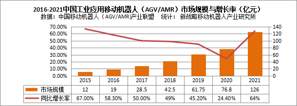圖表:2015-2021中國工業(yè)應(yīng)用移動機器人(AGV/AMR)市場規(guī)模(億元)與增長率